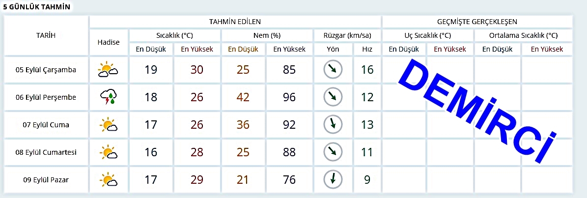 6 Eylül Perşembe günü Marmara’nın doğusu, Kuzey Ege’nin iç kesimleri, Batı ve Orta Karadeniz, Doğu Karadeniz kıyıları, İç Anadolu Bölgesi ve Doğu Akdeniz’in; 7 Eylül Cuma günü ise Marmara’nın doğusu, Karadeniz, İç Anadolu’nun kuzey ve doğu kesimleri, Doğu Akdeniz ile Doğu Anadolu’nun kuzey ve batı kesimlerinin gök gürültülü sağanak yağışlı geçeceği tahmin ediliyor.