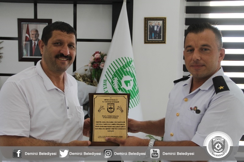 İlçe Jandarma Komutanı Okan Doğan, Demirci Belediyesinin İlçe Jandarma Komutanlığına verdiği destek, hizmet binanın tadilat ve onarımında ayrıca çevre düzenlemelerinden dolayı Başkan Selami Selçuk'a ahşap işlemeli teşekkür plaketi takdim etti.