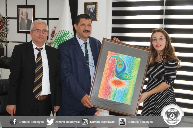 Belediye Başkanı Selami Selçuk'u makamında ziyaret eden öğrenciler, pastel boya ile yapılan tabloyu takdim ettiler.
