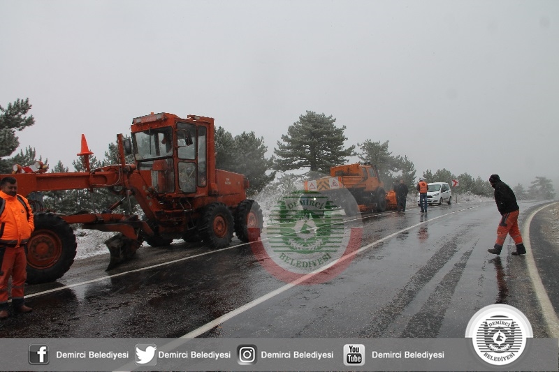 Demirci Karayolları ekipleri de kar yağışı ile birlikte Demirci - Simav karayolu Akçakertik mevkiinde olası bir buzlanmaya karşı devriye nöbetine başladı.