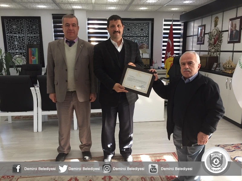 Ziyarette Demirci Şube Başkanı İzmirli tarafından Belediye Başkanı Selami Selçuk'un Demirci Türk Hava Kuruma çalışmalarına verdiği destekten dolayı Türk Hava Kurumu Genel Başkanı Bertan Nogaylaroğlu imzalı Teşekkür Belgesini takdim etti.