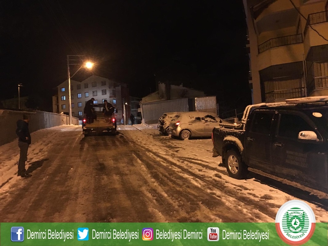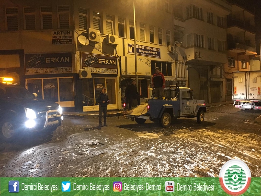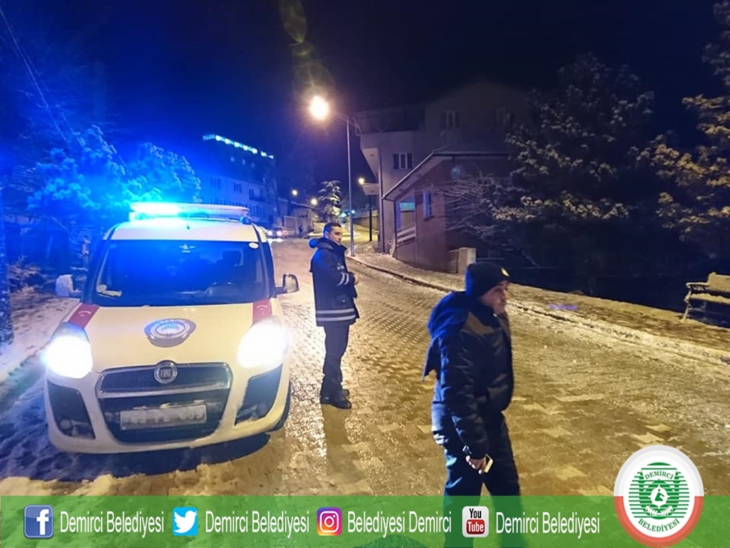 Kar yağışı ile birlikte Demirci Belediyesi Zabıta Müdürlüğü ekiplerince İlçe merkezinde tehlike arz eden noktalar tespit edilirken, gelen ihbarlarda değerlendirilerek Fen İşleri Müdürlüğü ekiplerine bildirildi.