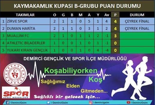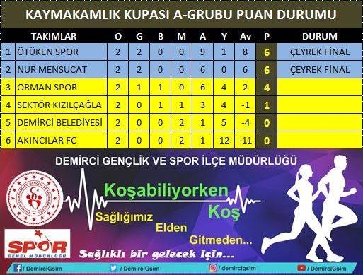 A ve B grubunda süren maçlarda Kaymakamlık Kupası 4. Geleneksel Futbol Turnuvasının 13 müsabaka sonunda oluşan puan tablosu şu şekilde oluştu.