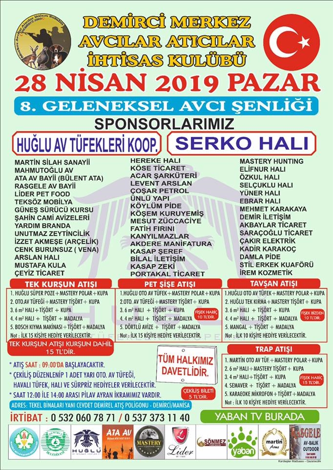 28 Nisan 2019 Pazar günü Avcılar Atıcılar İhtisas Kulübü tarafından Manisa Büyükşehir Belediyesi ve Demirci Belediyesinin katkıları ile yapılacak olan 8. Geleneksel Avcı Şenliğine Antalya, İzmir, Uşak, Aydın, Balıkesir ve Bilecik gibi birçok ilden 600'e yakın avcı ve atıcı katılacak.