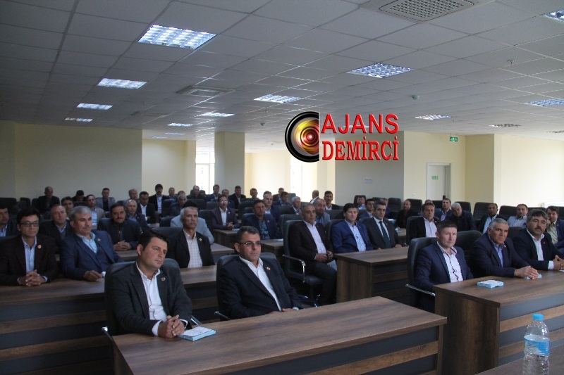 Milletvekili Uğur Aydemir, Kaymakam Mutlu Akyol ve Belediye Başkanı Selami Selçuk, toplantı salonunda muhtarların sorunlarını ve taleplerini dinledi.