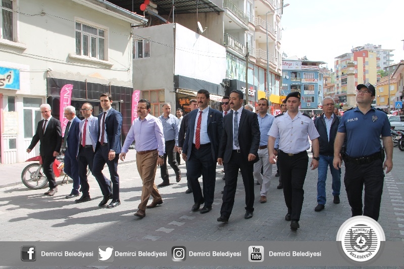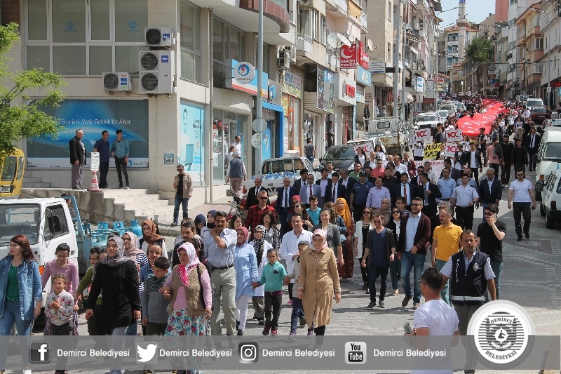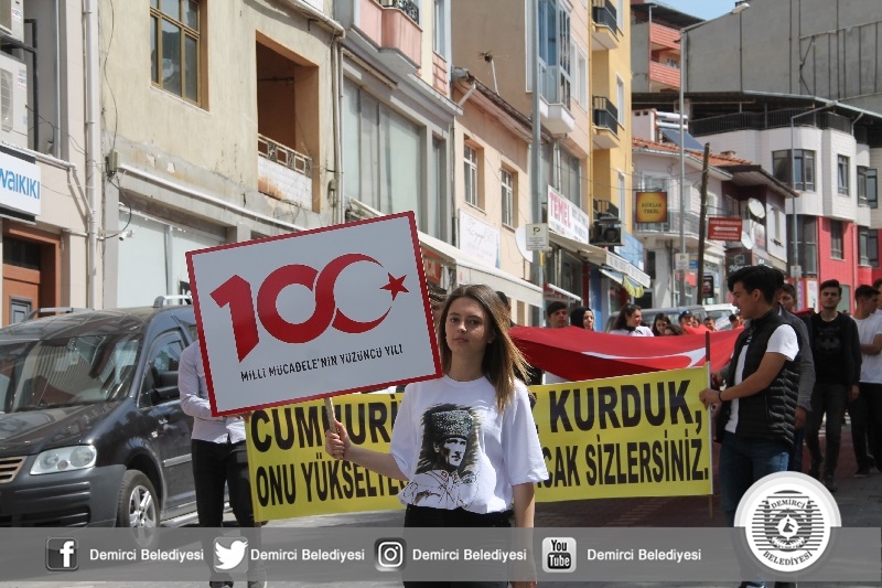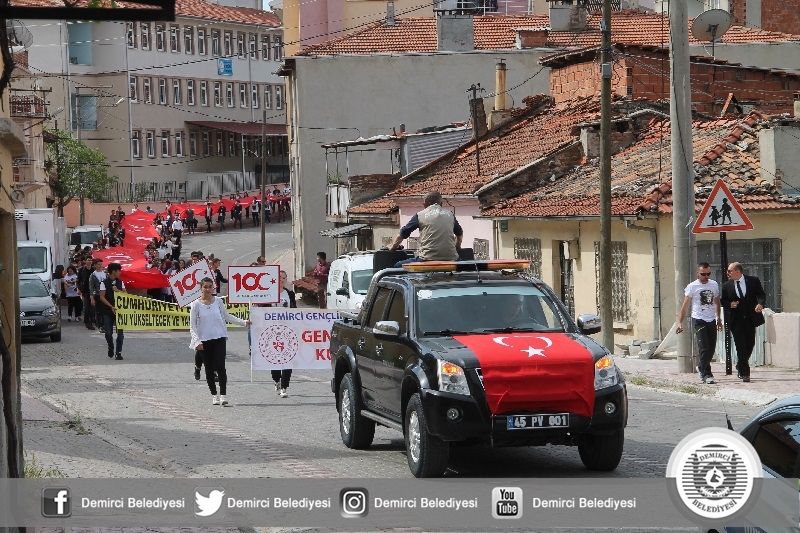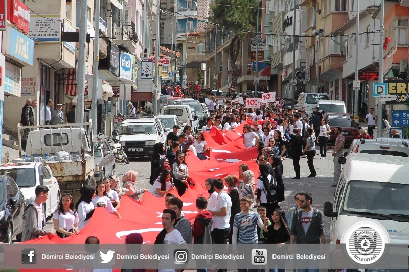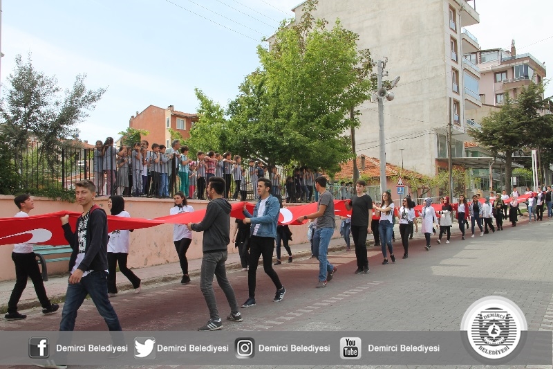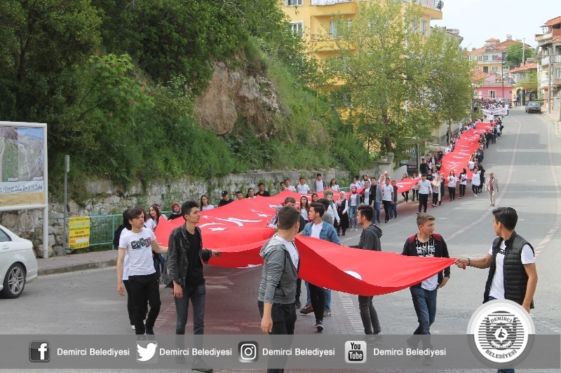 Demirci Anadolu Lisesi öğrencileri okullarının önünden başlayarak Çereşe meydanına kadar dev bayrak ile kortej yürüyüşü yapıldı.
