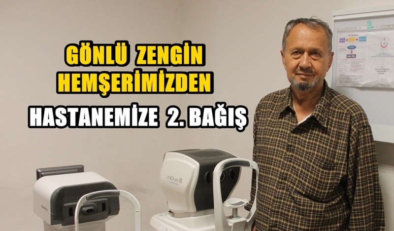 Eşini kalp hastalığı nedeniyle kaybederek hastaneye Elektro kardiyografi (EKG) cihazını bağışlayan 77 yaşındaki Mustafa Çamlı, şimdide ilçesindeki hastaneye Otorefkeratometre Göz ölçüm cihazı alarak bağışladı.