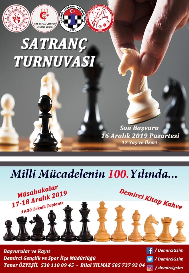 Satranç turnuvasına katılmak isteyenlerin 16 Aralık 2019 Pazartesi günü mesai bitimine kadar Demirci Gençlik Spor İlçe Müdürlüğüne başvurularını şahsen yapmaları gerekiyor.