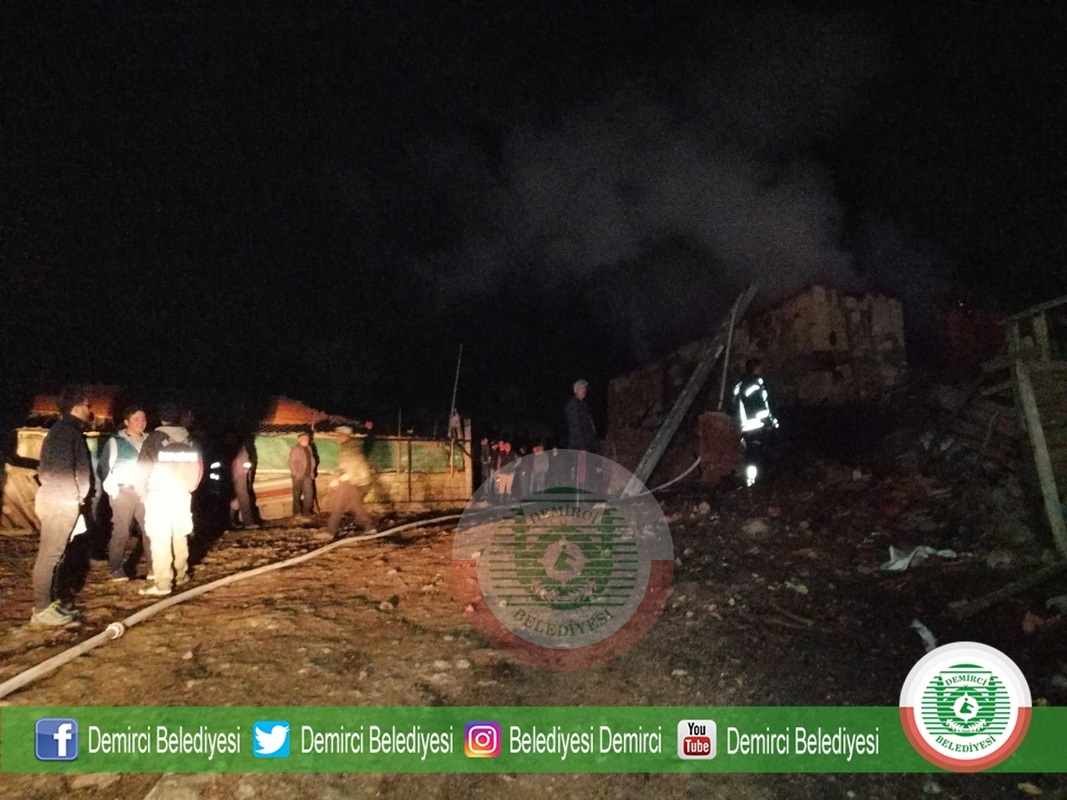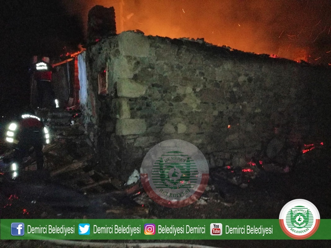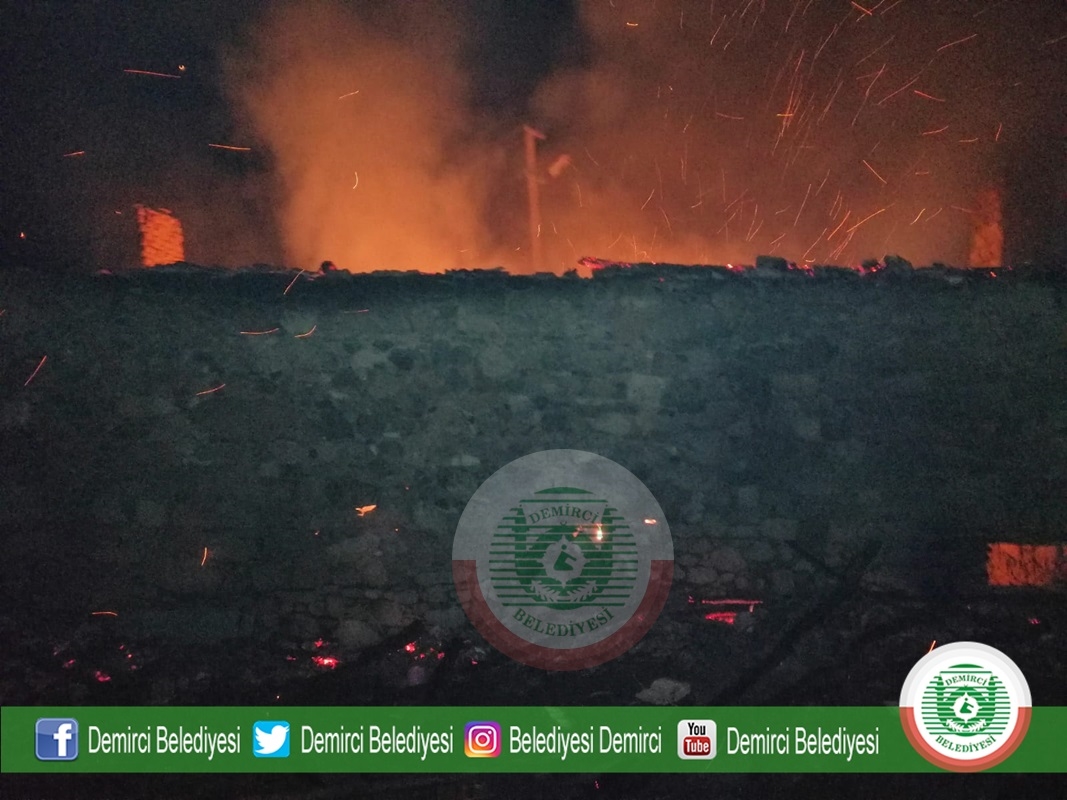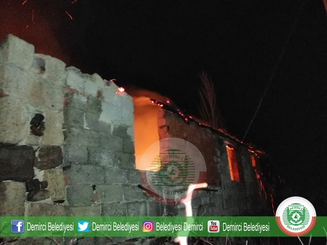 Demirci'de akşam saatlerinde meydana gelen yangında 2 katlı ev altında hayvan damı bulunan mesken yandı.