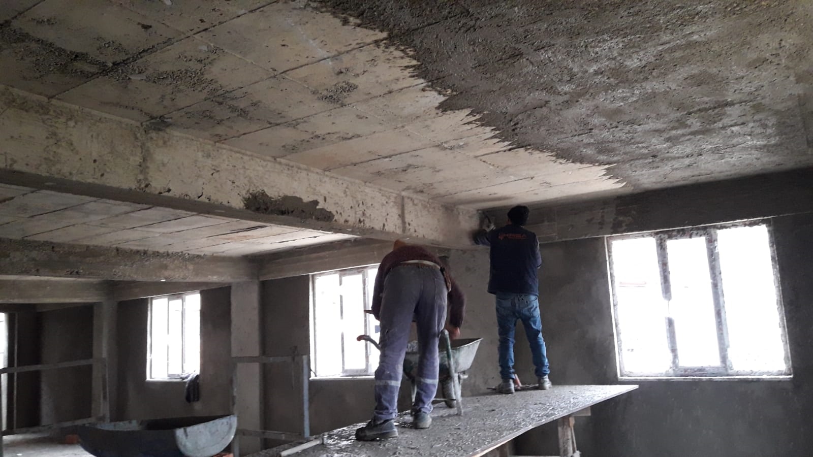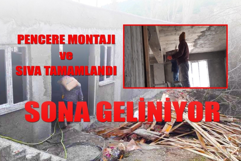Pencere montajlarının yapıldığı binada, ekipler tarafından dış ve iç cephede sıva çalışmalarında tamamlanmak üzere.
