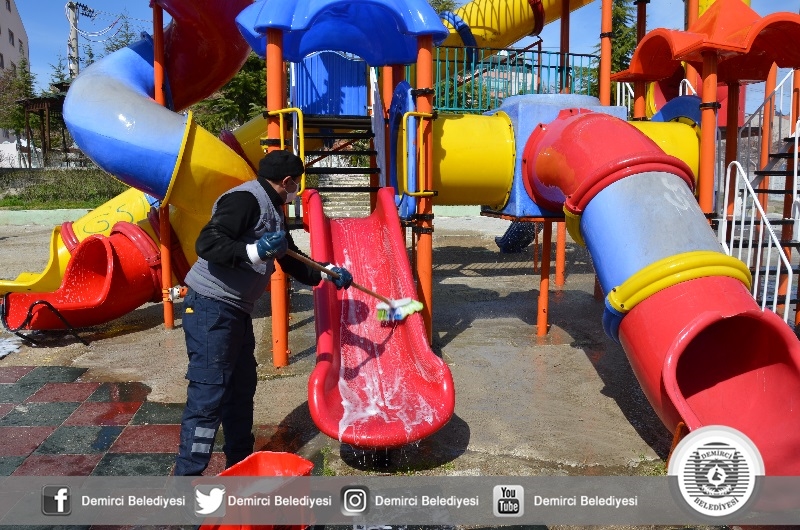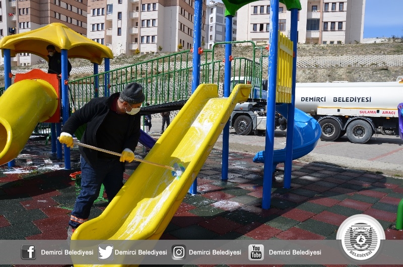 20 Mart Cuma günü Demirci Belediyesi Temizlik İşleri ekiplerince İlçedeki çocuk oyun parklarında çocuk oyun grupları deterjanla yıkanarak dezenfekte edildi. Diğer yandan belediye tankeri ile köpüklenen çocuk oyun grupları yıkandı.