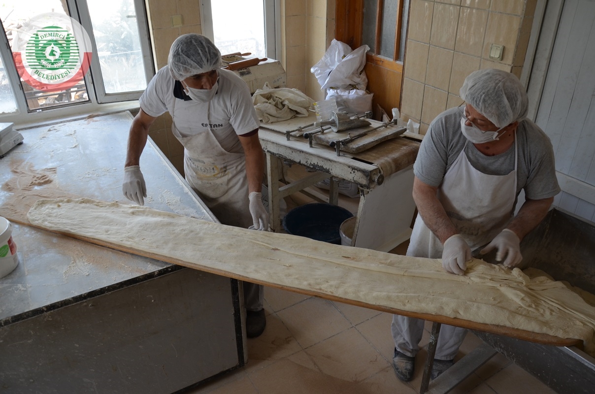 3,5 metre uzunluğundaki fırın küreğinin üzerine aynı uzunlukta pide açan fırıncı ustaları, yeni tip koronavirüs kapsamındaki tedbirlere dikkati çekmek amacıyla pidenin üzerine çörek otuyla "Evde Kal Türkiye 2020" yazısı işledi.