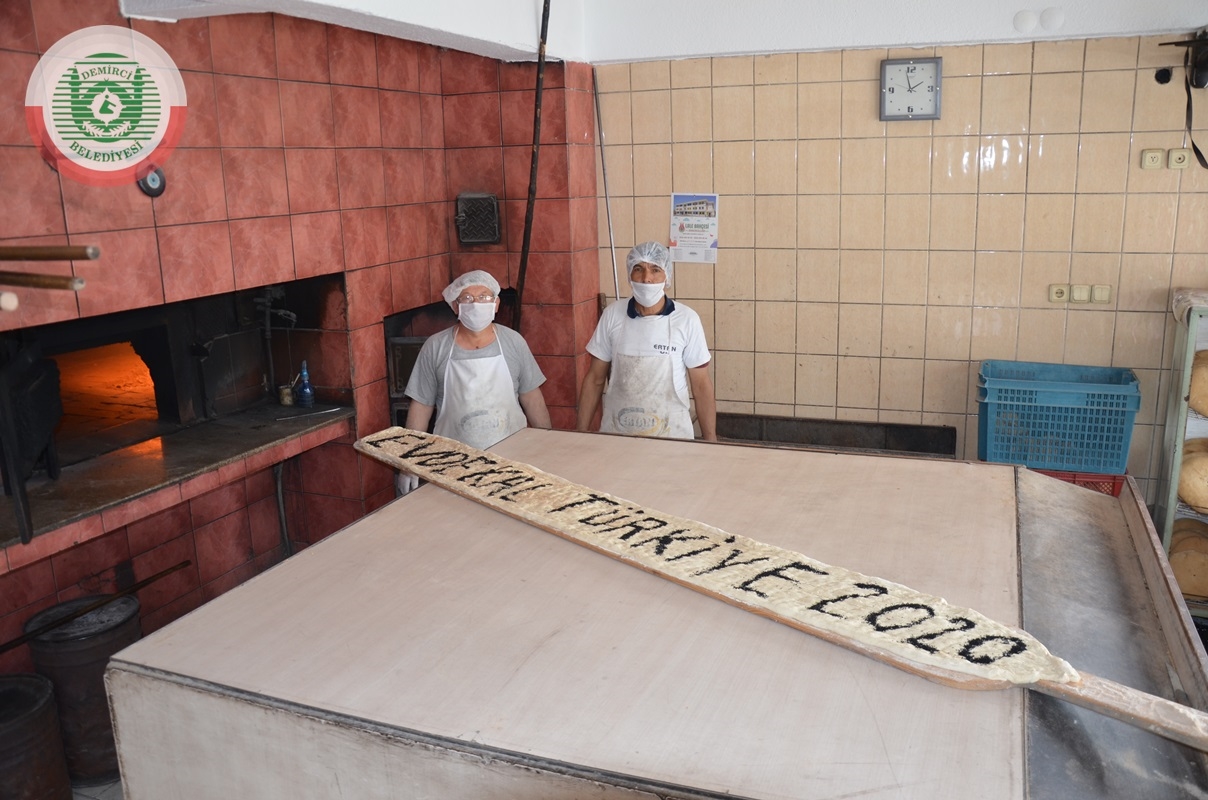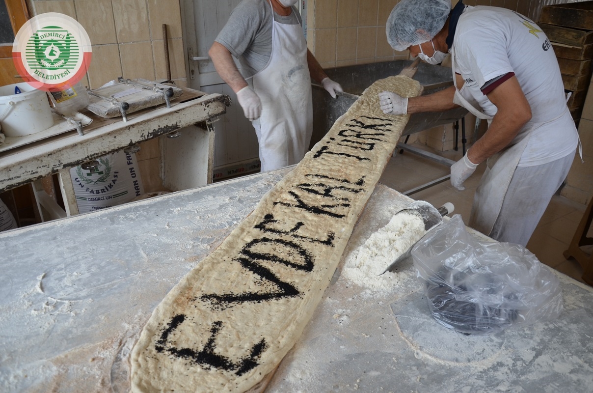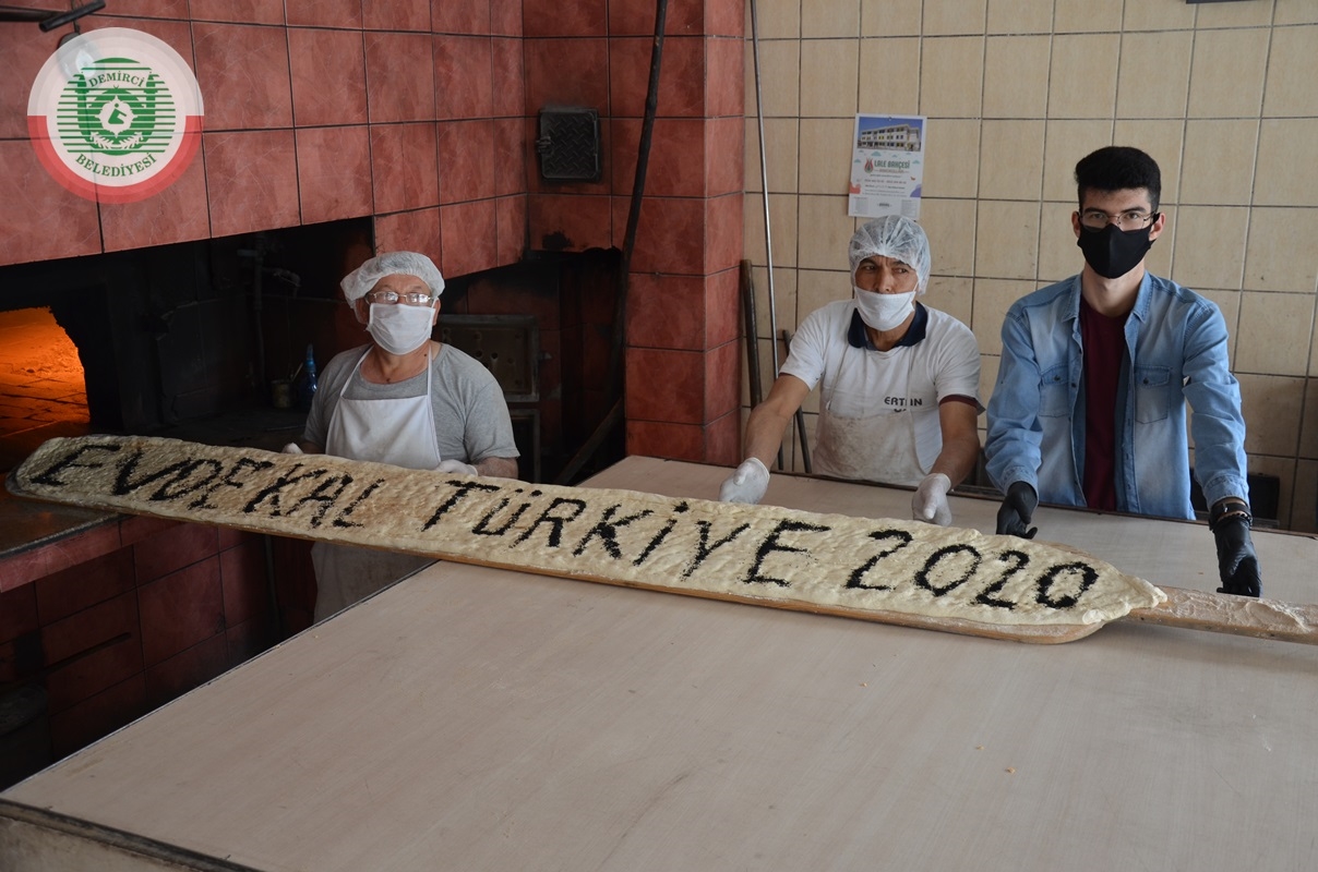 Demirci'de fırıncı esnafı, üzerine çörek otuyla "Evde Kal Türkiye 2020" yazdıkları yaklaşık 3,5 metrelik ramazan pidesi pişirdi.