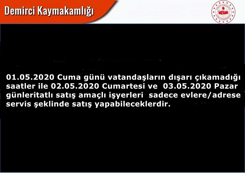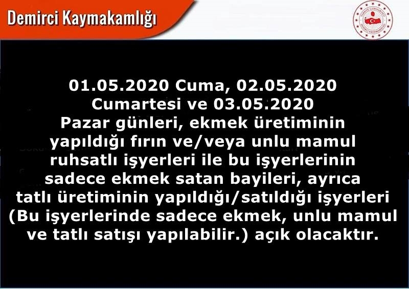 1 Mayıs Cuma günü vatandaşların dışarı çıkamadığı saatler ile 2 ve 3 Mayıs günleri tatlı satış amaçlı iş yerleri sadece evlere/adrese servis şeklinde satış yapabilecek.