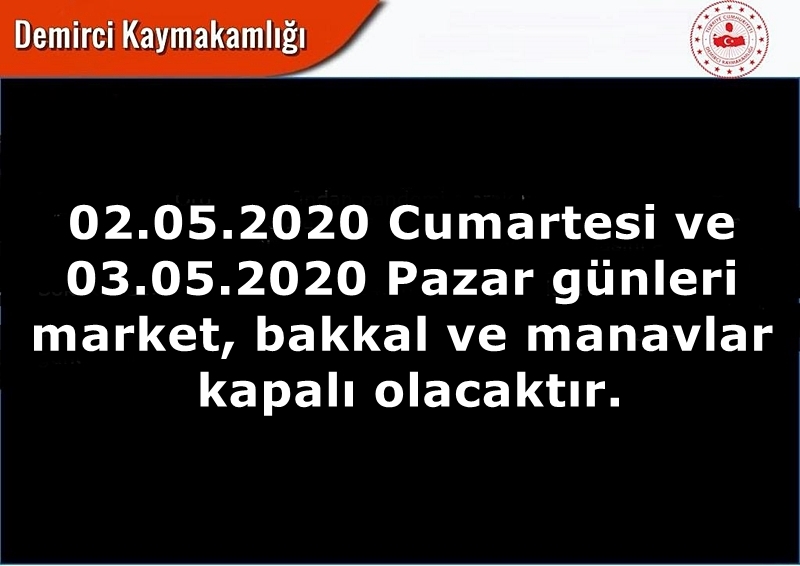 2 Mayıs Cumartesi ve 3 Mayıs Pazar günleri market, bakkal ve manavlar kapalı olacak.