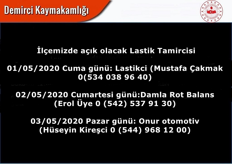 Demirci'de de Kaymakamlık makamı tarafından 01 - 02 ve 03 Mayıs tarihlerinde hizmet verecek olan benzin istasyonları ve lastikçilerin nöbetçi çizelgesi de yayınlandı.