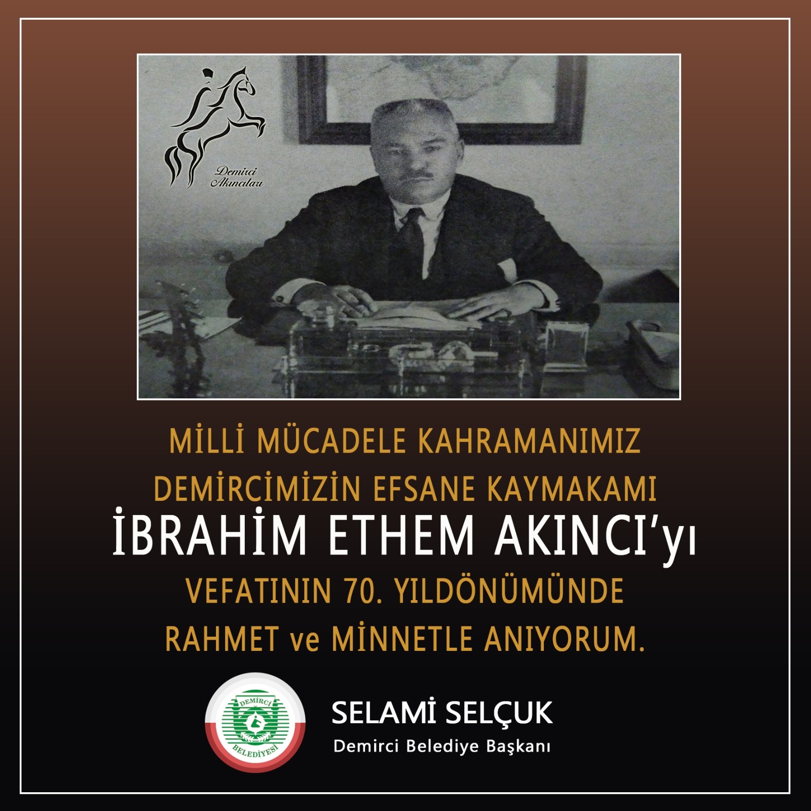 Belediye Başkanı Selami Selçuk yaptığı açıklamada " Bugün İstiklal Harbinin kahraman Demirci Kaymakamı İbrahim Ethem Akıncı'nın 70'inci ölüm yıldönümü. 11 Mayıs 1950 tarihinde vefat eden Kaymakam İbrahim Ethem Akıncı, Sındırgı'ya defnedilmişti. Bize şanlı bir tarih bırakan Demirci'nin ve Demirci Akıncılarının tarihe geçmesini sağlayan tarih yapan ve tarih yazan bir yiğitti. Demircilileri çok seven ve Demirci'nin çok sevdiği bir insan olarak gönüllerde yaşamaya devam ediyor" dedi.