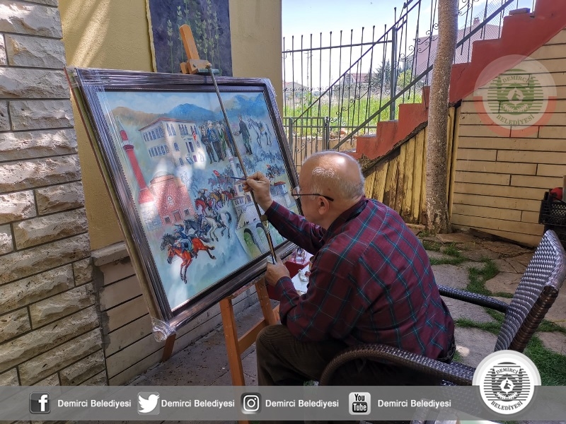 Demircili ressam İsmail Çeşmeci (64), milli mücadele döneminin kahraman kaymakamı İbrahim Ethem Akıncı'nın vefatının 70. yılı dolayısıyla üzerinde doğup büyüdüğü ilçenin tarihi mekanları ile Demirci Akıncıları atlılarının yer aldığı yağlı boya özel bir tablo hazırladı.