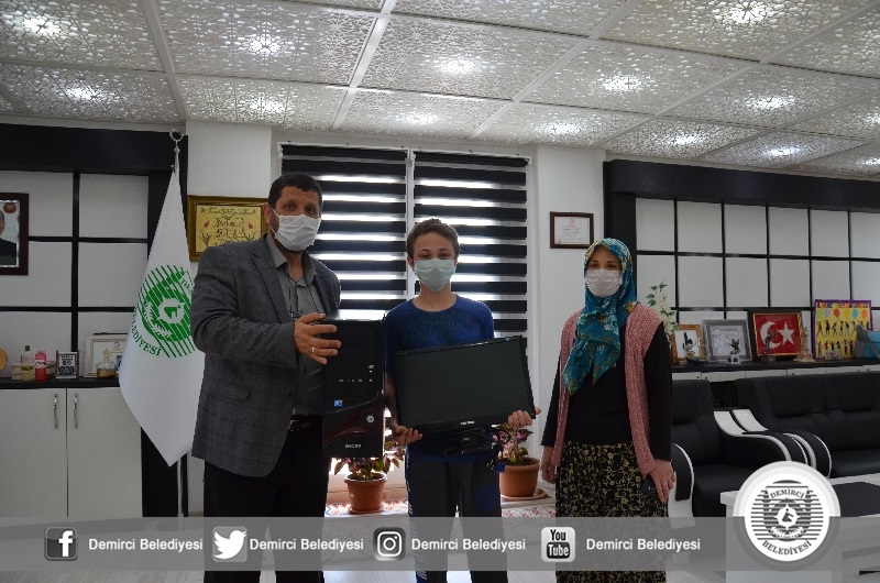 Demirci ilçesinde uzaktan online eğitime katılamayan 2 kardeşe Belediye Başkanı Selami Selçuk tarafından bilgisayar hediye edildi.