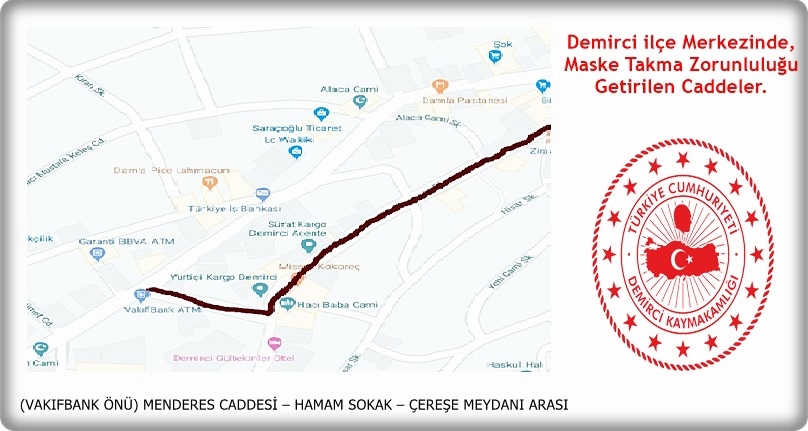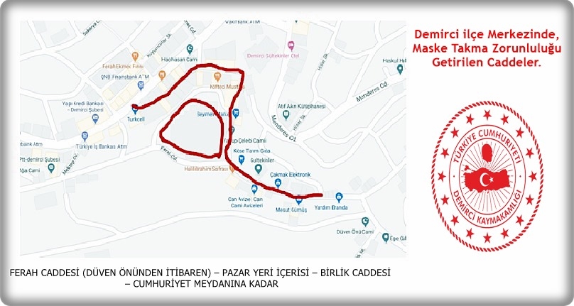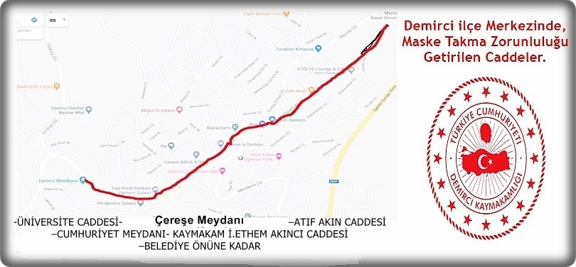 Demirci Kaymakamlığından yapılan açıklamada, maskesiz dolaşmanın ve bulunmanın olduğu cadde ve meydanlar şu şekilde açıklandı.