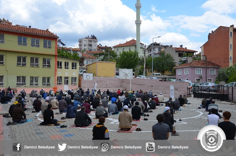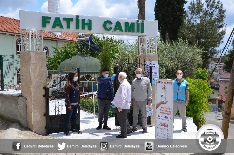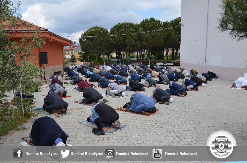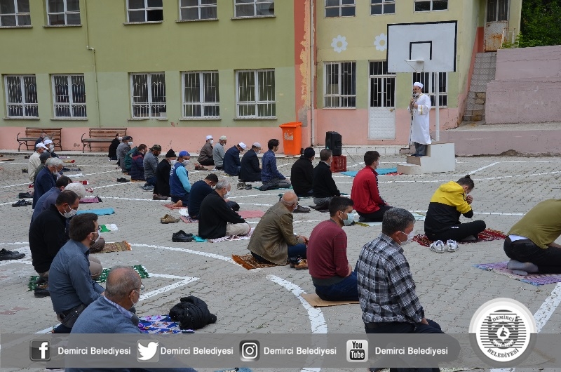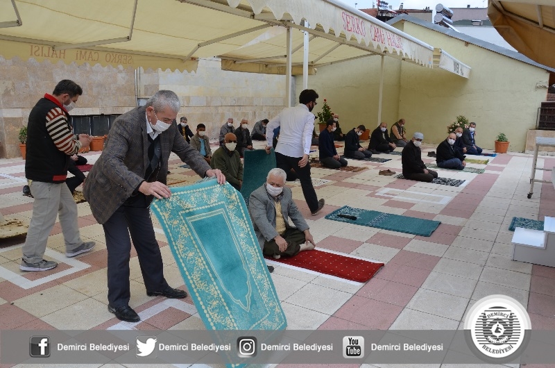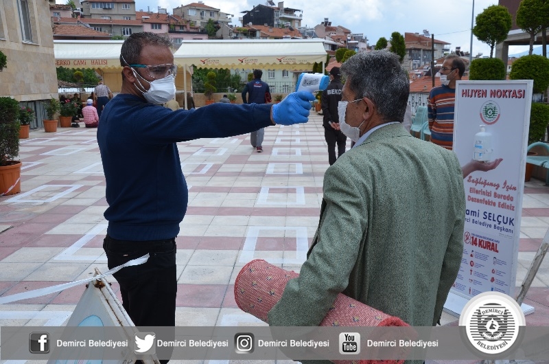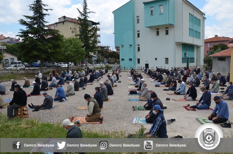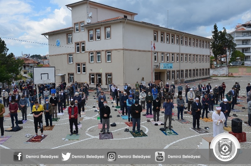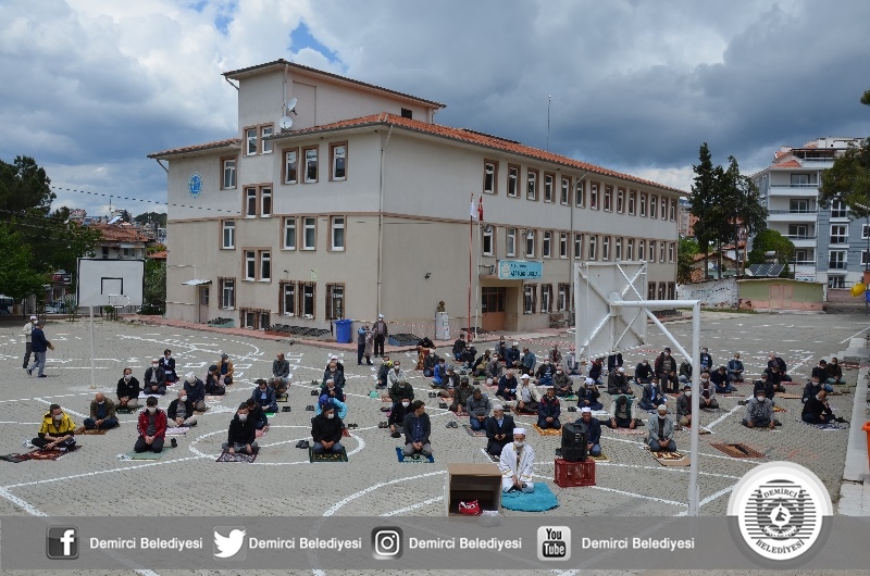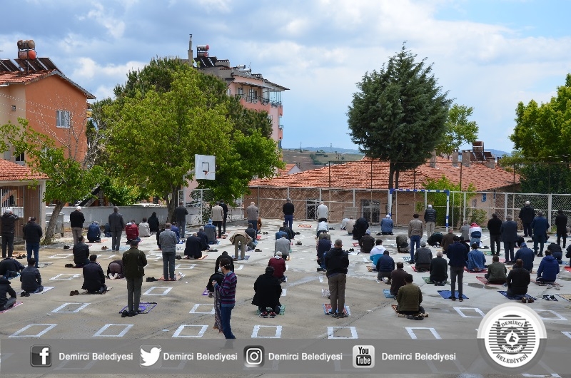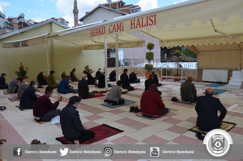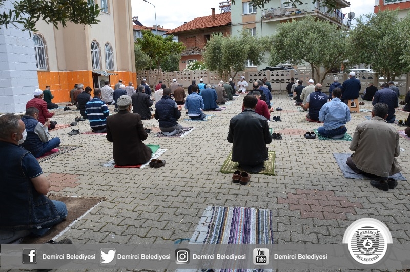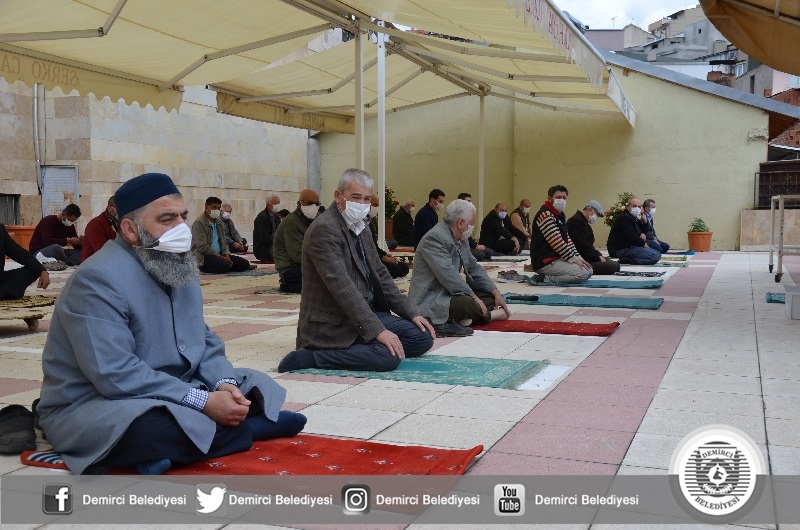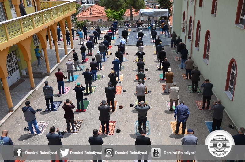 29 Mayıs Cuma günü Demirci'de de Kaymakamlık makamı tarafından belirlenen cami ve meydanlarda, gerekli sosyal mesafe kuralları alınarak cuma namazı kılındı.