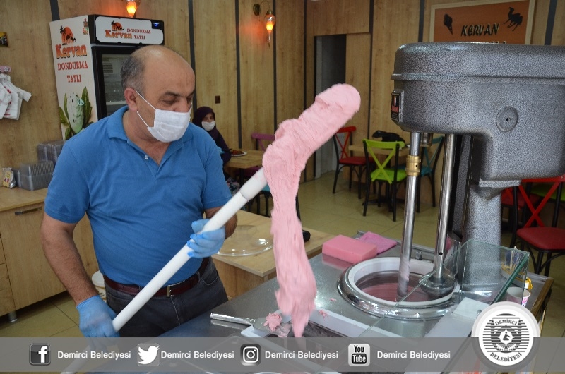 Usta Aymergen bu kez de kirazlı dondurma üreterek müşterilerine farklı bir lezzet sunmanın yanı sıra, ilçenin ürününün tanıtımına da destek veriyor.