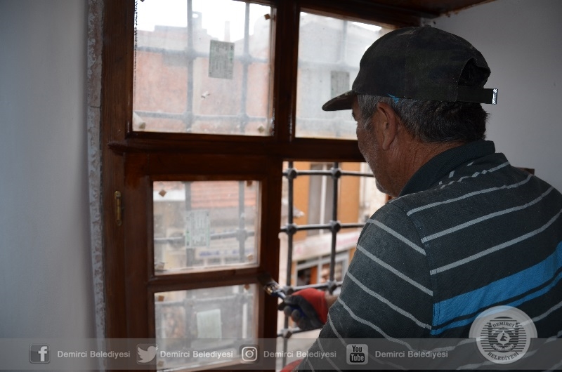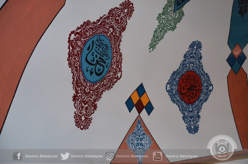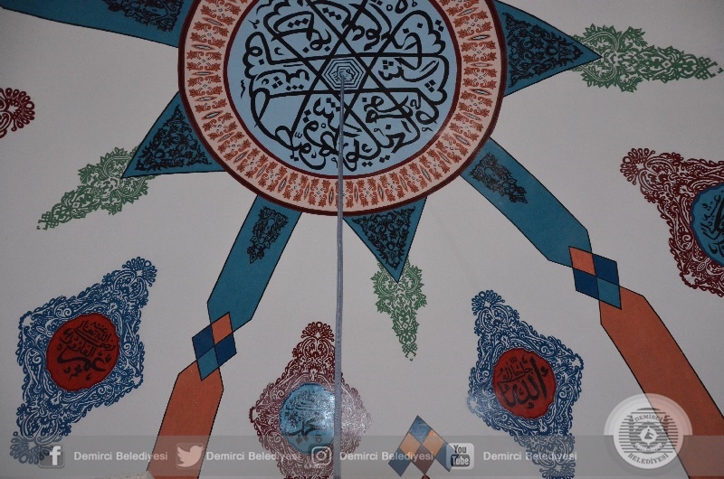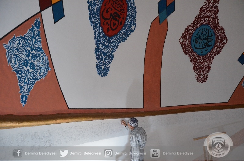 Tarihi Caminin iç cephesinde kubbe kemeri altında nakkaş İbrahim Tosun tarafından nakkaş çalışmalarına hızla sürdürülürken, pencerelerde boyama ve pencere kenarlarında da nakkaş için ön çizim çalışması yapılıyor.