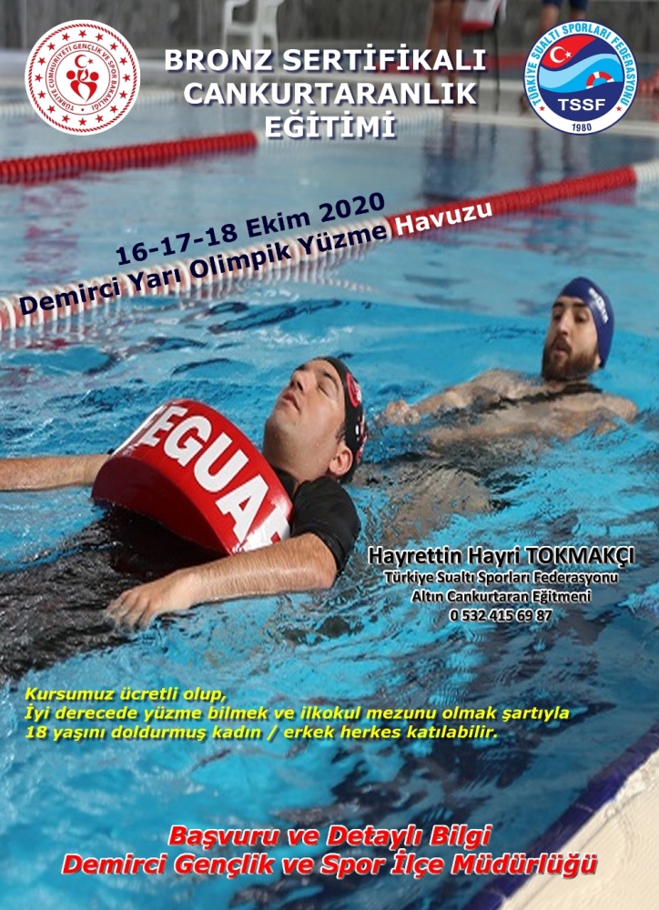 16-18 Ekim 2020 tarihlerinde Demirci Yarı Olimpik Yüzme Havuzu'nda Türkiye Sualtı Sporları Federasyonu Altın Cankurtaran Eğitmeni Hayrettin Hayri TOKMAKÇI nezaretinde verilecek kursumuz ücretli olup, iyi derecede yüzme bilen, ilkokulu mezunu, 18 yaşını doldurmuş kadın-erkek herkes katılabilecektir.