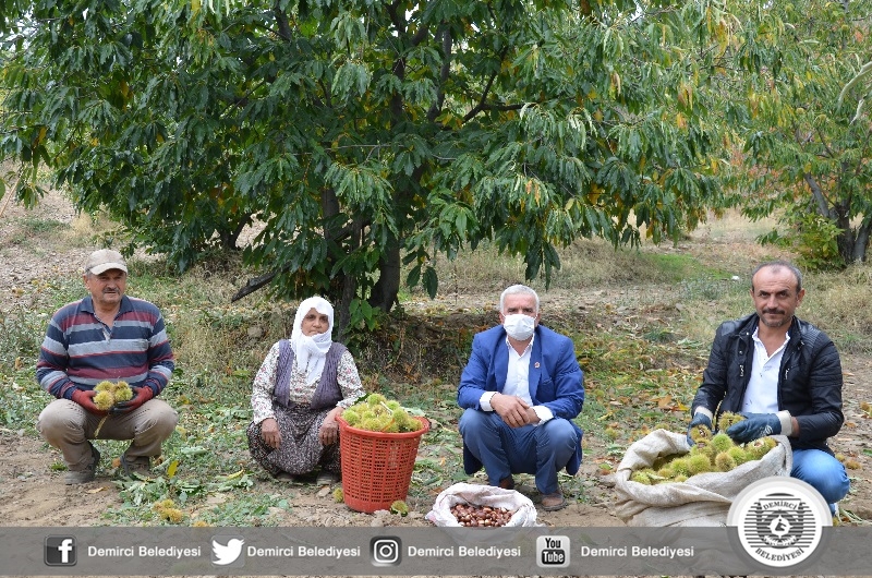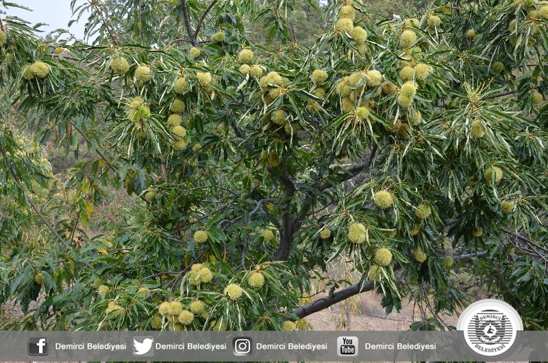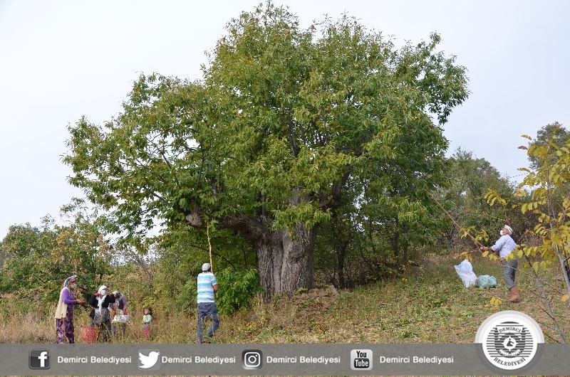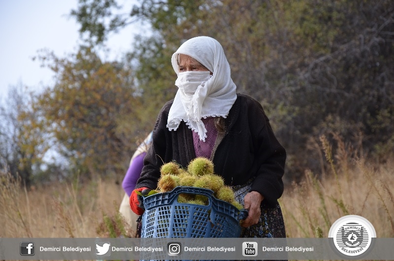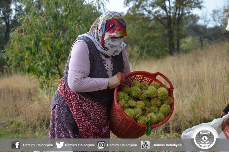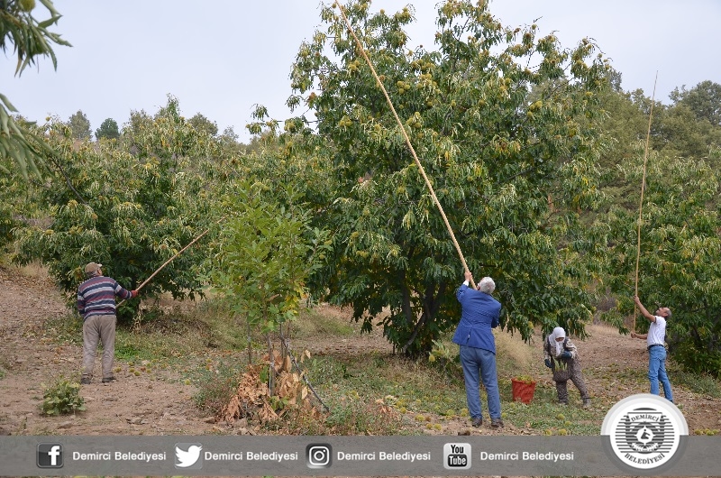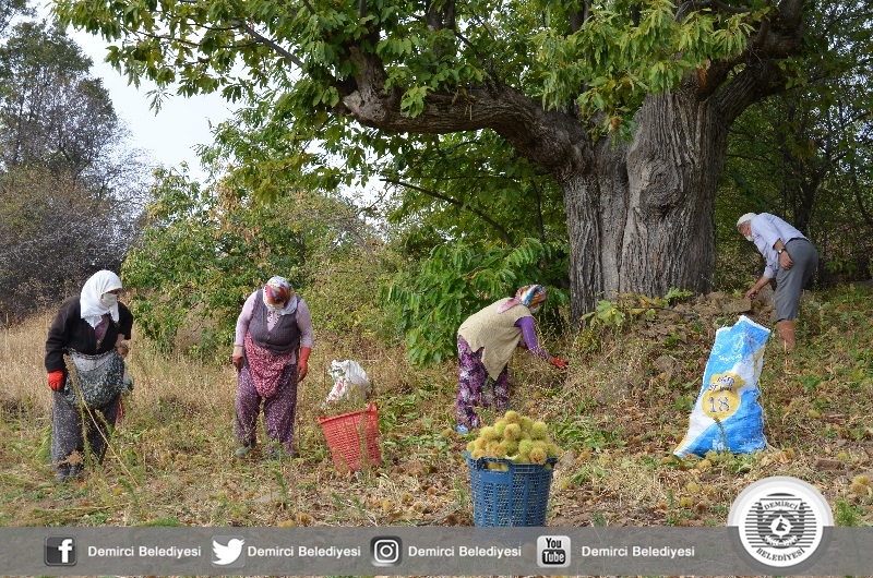 Hünnap, kiraz, badem ve ceviz gibi önemli tarım ürünlerinin yetiştirildiği Demirci'nin yüksek rakımlı yaylalarında üretimi hızla yaygınlaşan kestanede hasat devam ediyor.