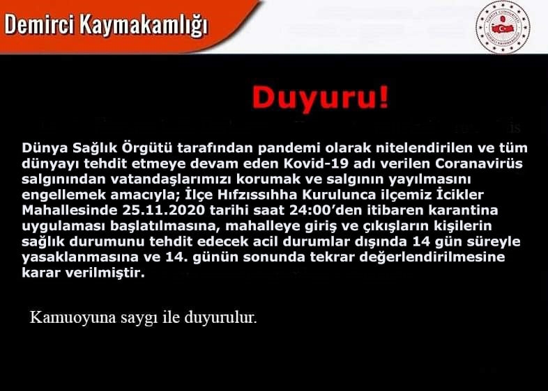 Demirci'de Kovid-19 salgını tedbirleri çerçevesinde İlçe Hıfzıssıhha Kurulu kararınca İcikler mahallesi 14 gün karantinaya alındı.