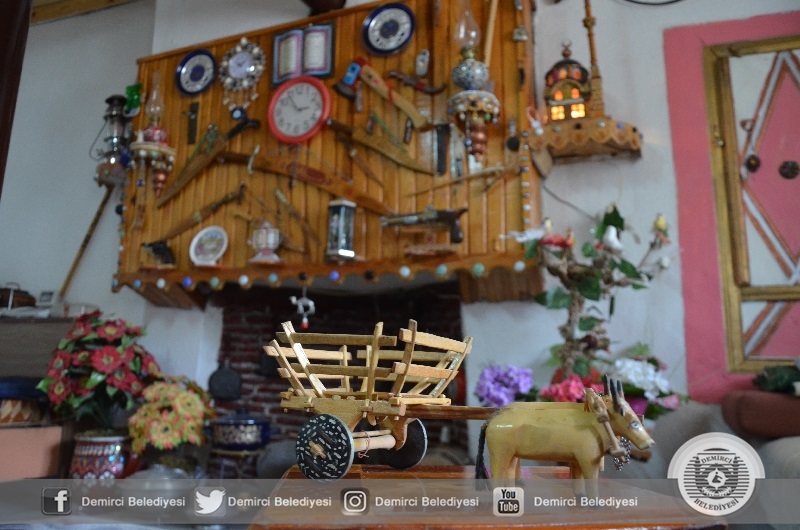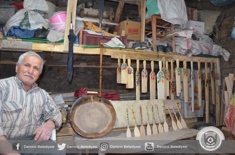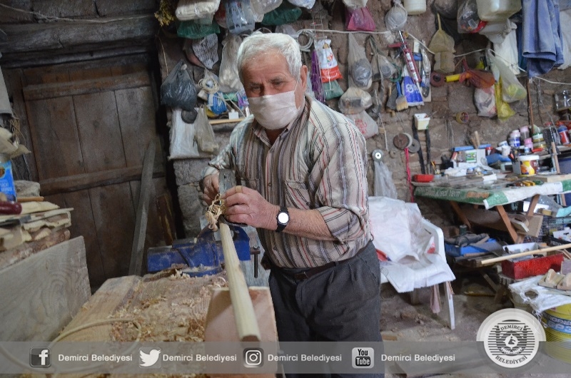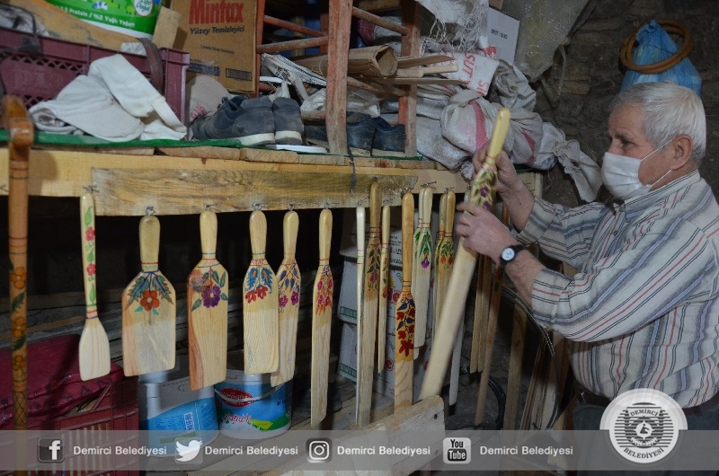 Demirci'de yaşayan 78 yaşında Ayhan Yılmaz, atölyesinde ahşaptan ürettiği el işi mutfak eşyaları, beşik, baston ve oyuncakları çevresindekilere hediye ediyor.