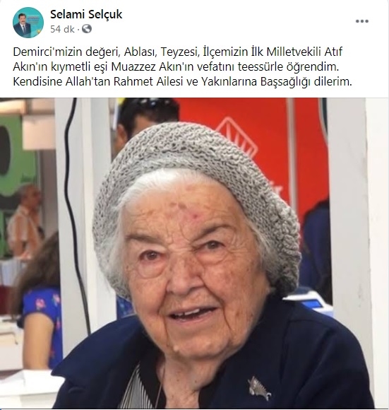 Demirci Belediye Başkanı Selami Selçuk'ta, vefat eden Muazzez Akın için taziye mesajı yayınladı.