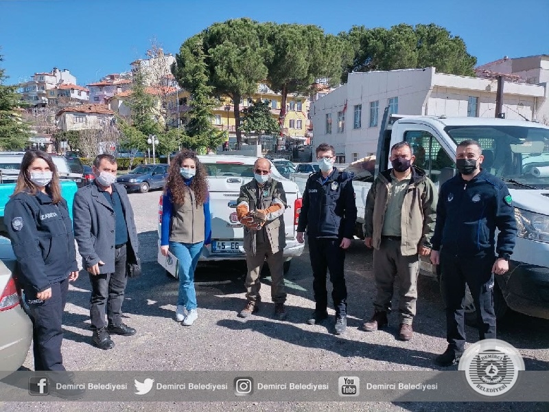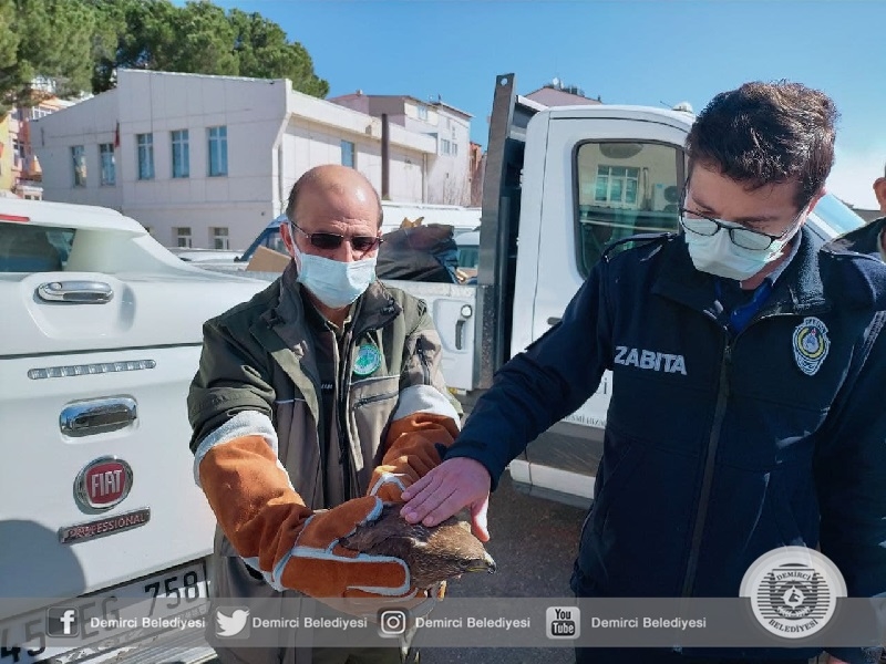 Arazide vatandaşlar tarafından yaralı olarak bulunan şahin Demirci Belediyesi Zabıta Müdürlüğü ekiplerince teslim alındı.