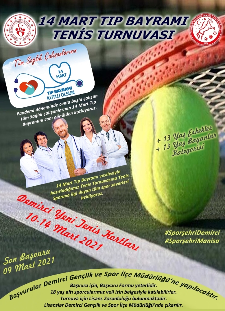 Demirci Gençlik ve Spor İlçe Müdürlüğü ve Demirci Akıncıları Gençlik ve Spor Kulübü tarafından organize edilen 14 Mart Tıp Bayramı Tenis Turnuvası pandemi döneminde gecesini gündüzüne katarak çalışan sağlık personelinin onore etmek amacıyla yapılacak.