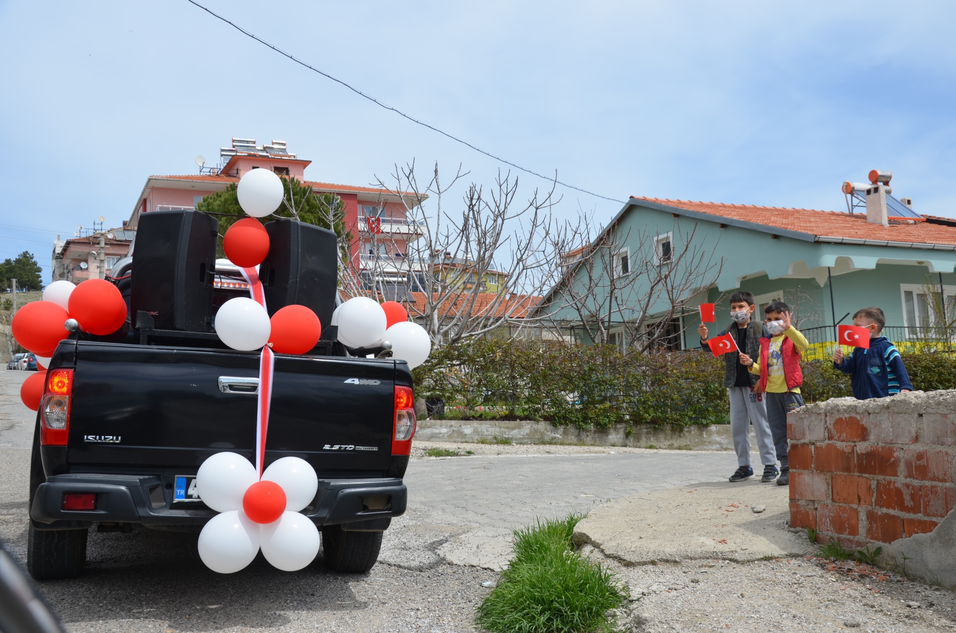 Demirci'deki kutlama etkinlikleri kapsamında belediye tarafından kırmızı beyaz balonlarla ve bayraklarla süslenen araçtan, evlerindeki çocuklar 23 Nisan'a özel çocuk şarkıları çalındı.