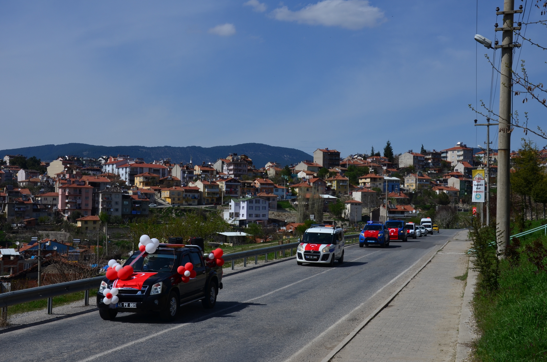 Demirci Belediyesi, İlçe Emniyet Müdürlüğü ve İlçe Jandarma Komutanlığı tarafından oluşturulan konvoy ilçenin ve cadde sokaklarını müzikler ve sirenlerle dolaşarak 23 Nisan Ulusal Egemenlik ve Çocuk Bayramı kutlamalarına destek verdiler.