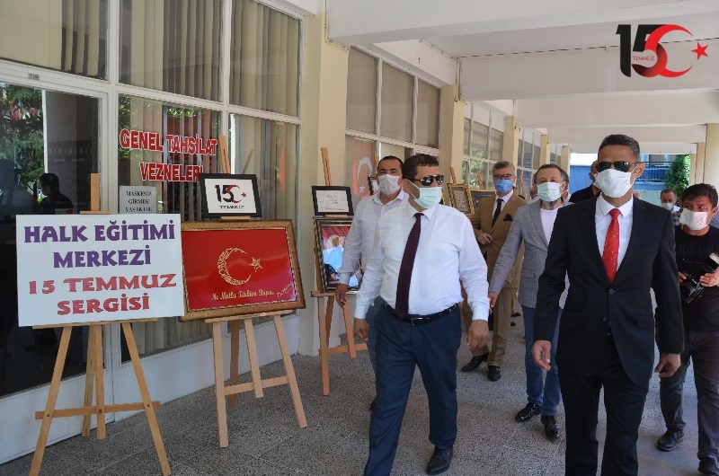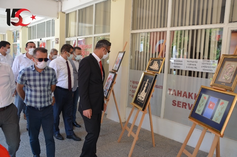 Demirci Kaymakamı Adem Kaya ve Belediye Başkanı Selami Selçuk daha sonra Halk Eğitimi Merkezi Müdürlüğü kursiyerleri tarafından hazırlanan 15 Temmuz Sergisini açılış kurdelesini keserek, yapılan eserleri incelediler.