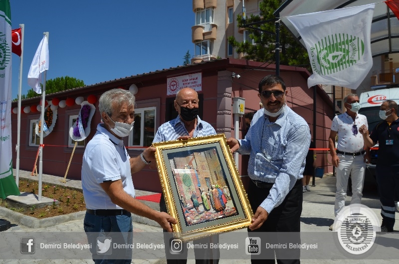 Belediye Başkanımız Selami Selçuk ise, Hayırsever Hasan Akdemir'e Demirci Halk Eğitimi Merkezi Müdürlüğü kursiyerlerince yapılan tablo ve plaket hediye edildi.