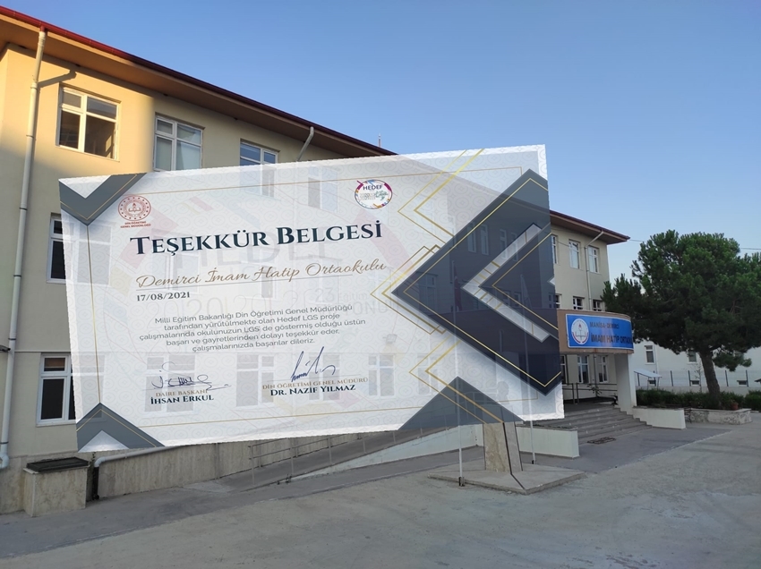 " Milli Eğitim Bakanlığı Din Öğretimi Genel Müdürlüğü tarafından yürütülmekte olan Hedef LGS proje çalışmalarında okulunuzun LGS'de göstermiş olduğu üstün başarı ve gayretlerinden dolayı teşekkür eder, çalışmalarınızda başarılar dilerim " denildi.