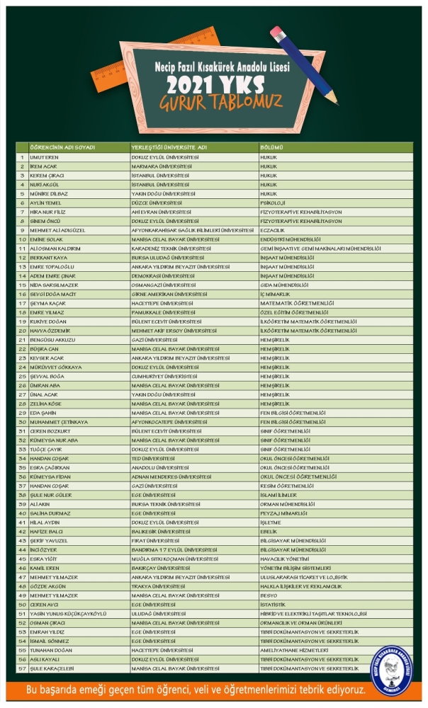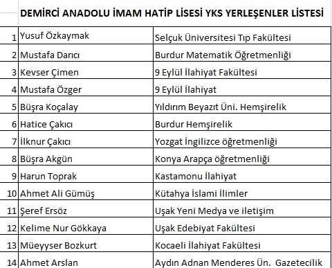 Demirci Necip Fazıl Kısakürek Fen Lisesi ve İmam Hatip Lisesi'nde üniversiteye yerleşenler ise şöyle ;