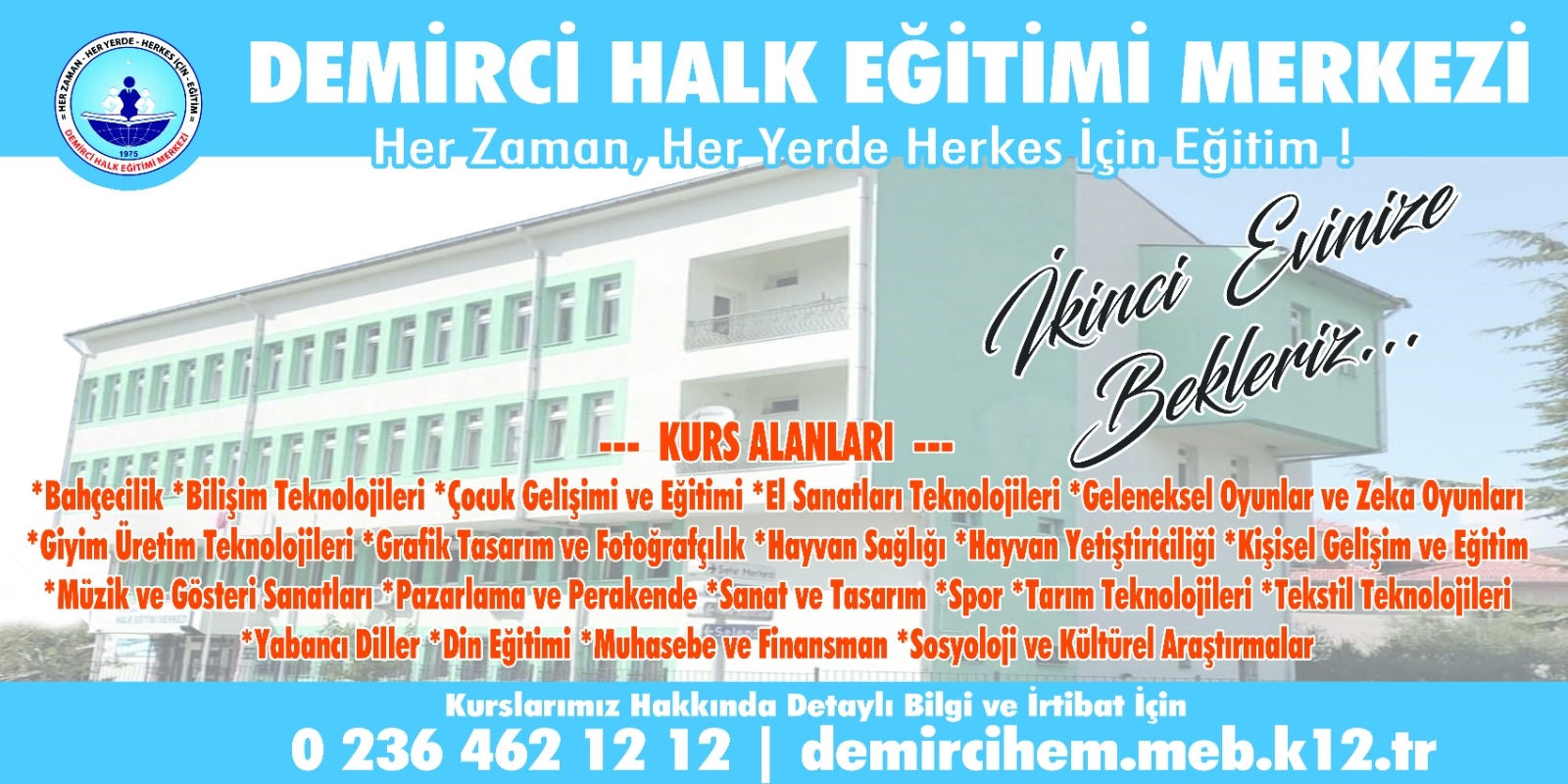 Demirci Halk Eğitimi Merkezi Müdürü İsmail Çetinkaya yaptığı açıklamada " Kurumumuz bünyesinde kurslarımıza başvuru yapmak isteyen herkesi bekliyoruz. Şu anda Dikiş, Nakış, Kağıt Rolyef, Takı Tasarım, Ebru, Naht, Müzik, Spor, Tarım, Hayvancılık, Bilgisayar, F Klavye, İşaret Dili, Minyatür Halı Dokuma, İngilizce, Okuma - Yazma, Resim, Bağlama, Keman, Gitar, Arapça, Kuran-ı Kerim, Siyer, Üniversite Hazırlık ve benzeri kurslar için başvurular yapılyor. Bunun yanı sıra 3739 branşta kurslar için gençlerimiz ve vatandaşlarımız kurumumuza gelerek bilgi alabilirler istedikleri kursa başvuru yapabilirler. Her daim söylediğimiz gibi " 2. Evinize Bekleri Siz Gelemiyorsanız, Biz Geliriz " diyerek Demirci'mizin merkezinden kırsala her alanda kurslar açmaya devam edeceğiz " dedi.