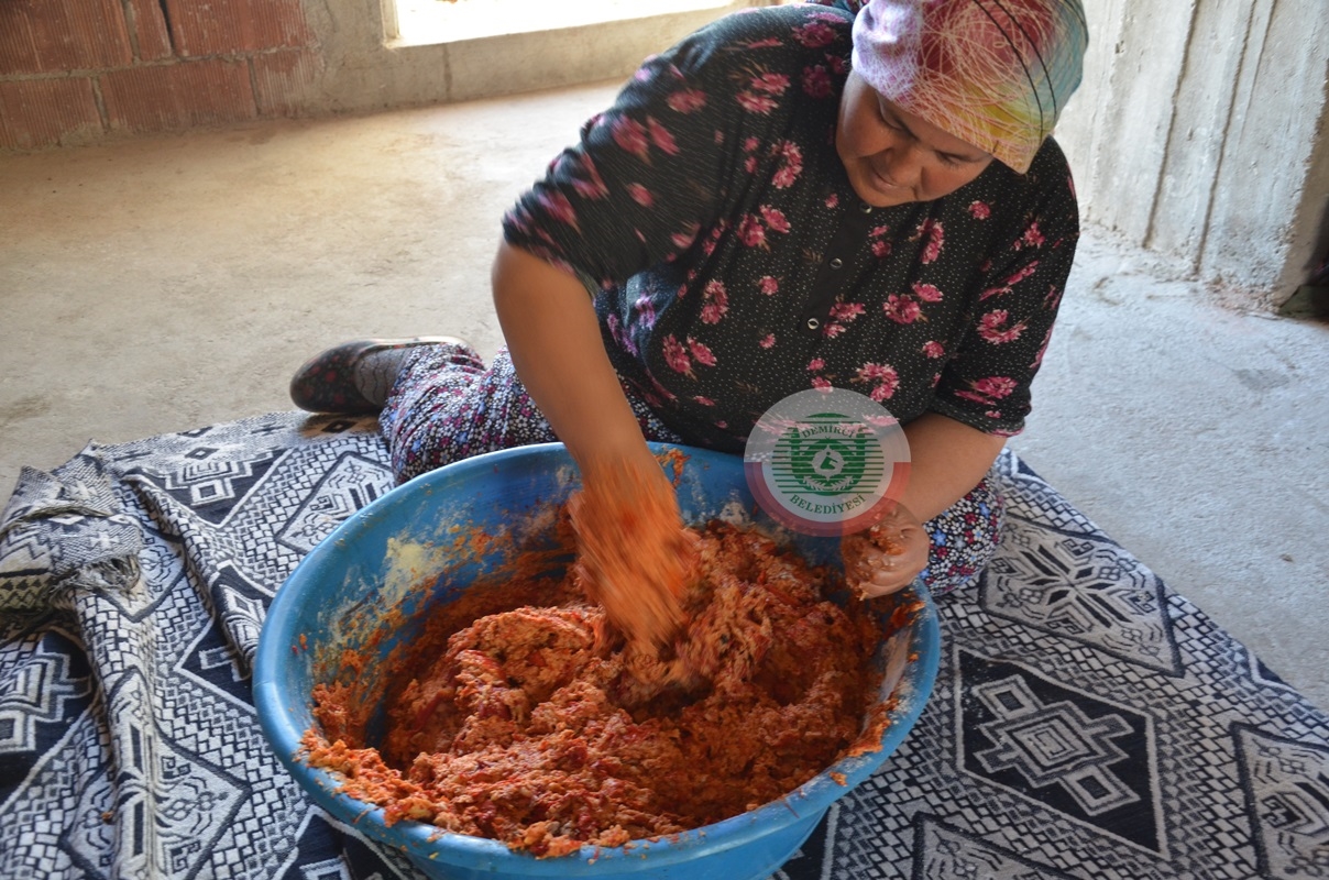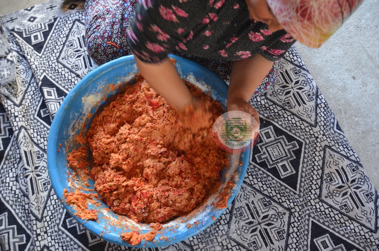 Kazandaki biber, bitki ve sebzeler ile birlikte 6 saat boyunca odun ateşinde pişiriliyor. Haşlanan malzemeler hamurla karıştırılarak elle yoğruluyor.