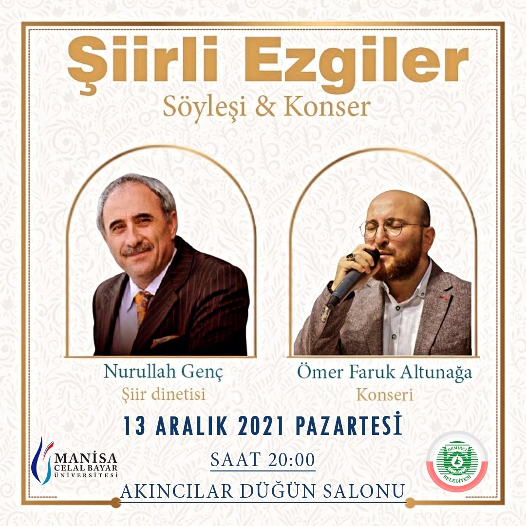 Demirci Belediyesi ve Manisa Celal Bayar Üniversitesi Demirci Eğitim Fakültemizin işbirliği ile " Şiirli Ezgiler Söyleşi ve Konser " programı düzenlenecek.