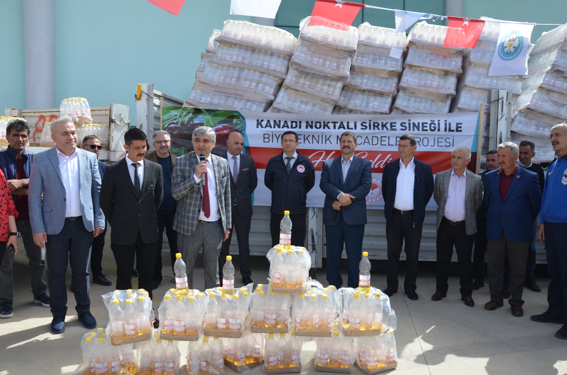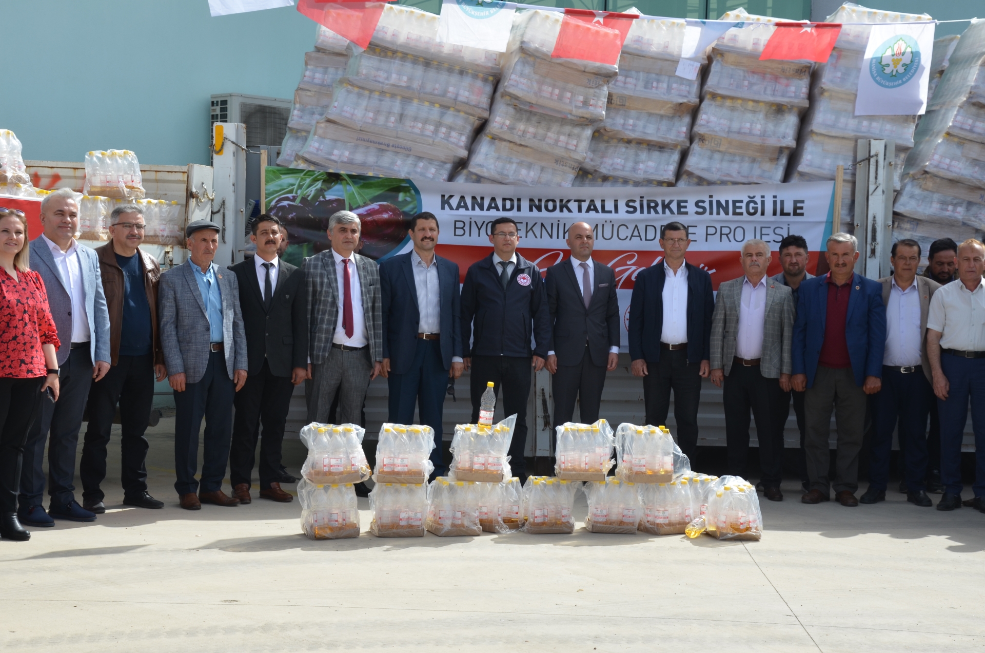 Kanadı noktalı sirke sineği ile biyoteknik mücadele projesi kapsamında Demirci ilçesinde 1010 dekar alanda kullanılmak üzere 36 bin 704 şişe elma sirkesi dağıtımı gerçekleştirildi.