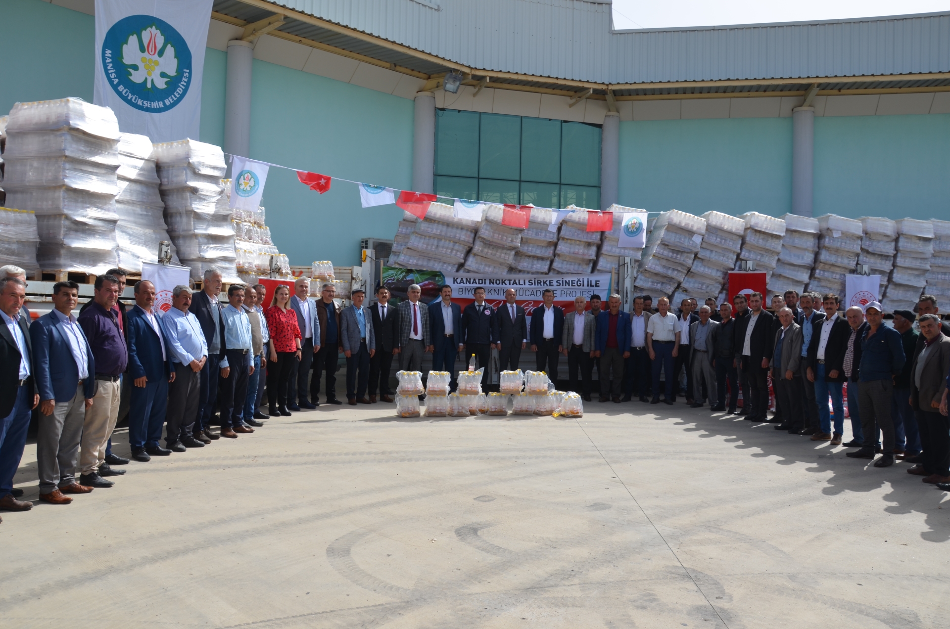 Manisa Büyükşehir Belediyesi, Demirci’de yapılan dağıtım töreni ile birlikte 1319 üreticinin 3245 dekar kiraz bahçesinde kullanılmak üzere tedarik ettiği 100 bin şişe elma sirkesinin dağıtımını noktaladı.