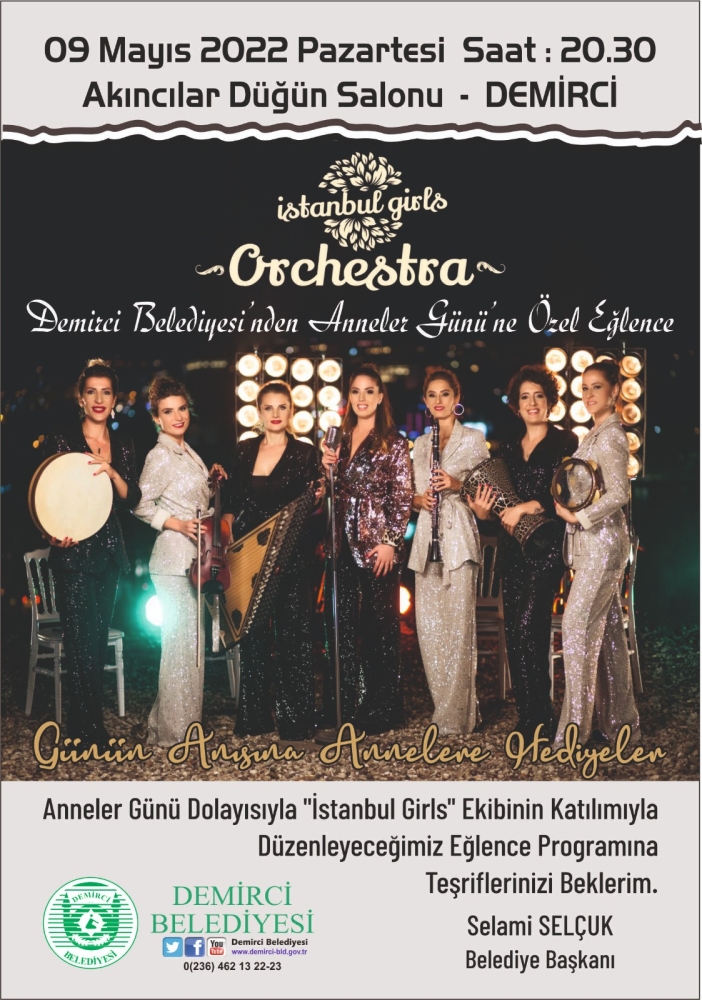 İstanbul Girls Orkestrasının katılımı ile 09 Mayıs Pazartesi ( Bu Akşam ) Saat: 21.00'da Akıncılar Düğün Salonunda Annelere özel eğlence programı yapılacak.