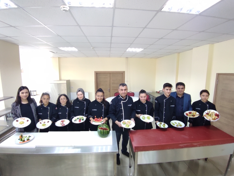 60 öğrencinin eğitim gördüğü yiyecek içecek hizmetleri bölümünde öğrenciler Avrupa Mesleki Beceriler Haftası kapsamında " Genç Şefler " projesi ile öğrenciler birbirinden güzel meyve ve sebze tabakları hazırladı.