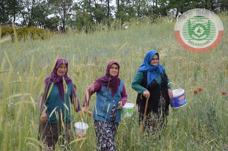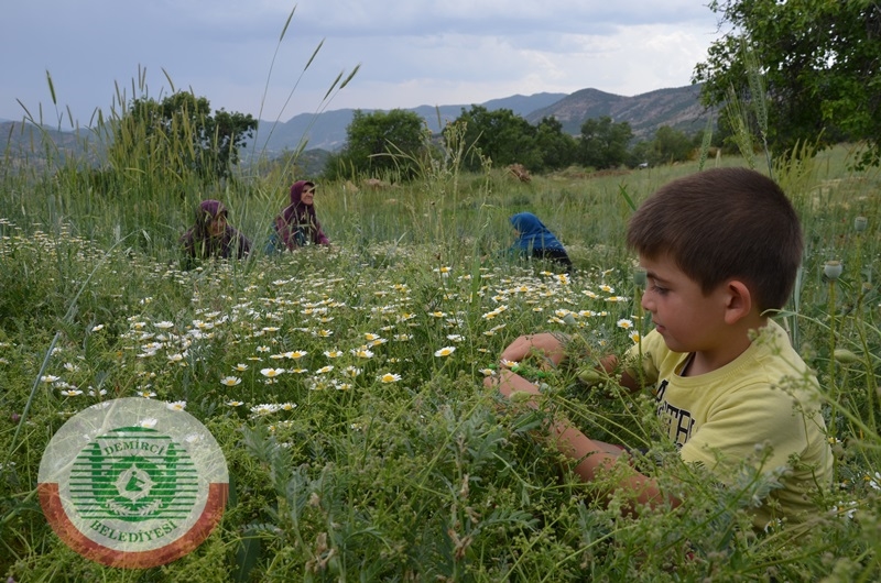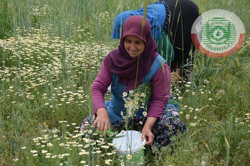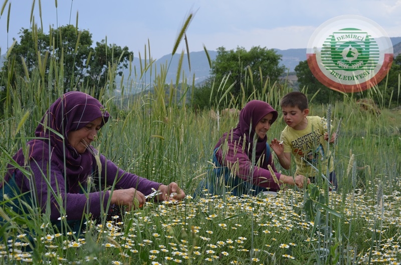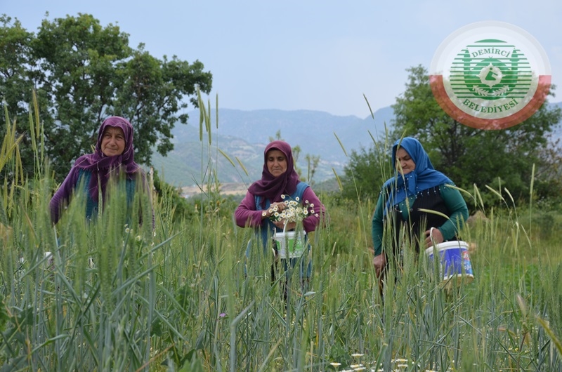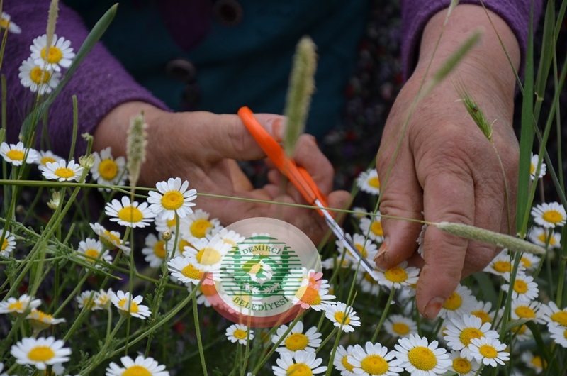 Demirci'de Kışlak, Yavaşlar, İmceler, Danışmentler, Gürçeşme, Elek, Esenyurt, Ulacık ve Rahmanlar mahallelerindeki kadınlar sabahın erken saatlerinde ve akşam saatlerinde dağlara ve yaylara giderek doğada yetişen papatyaları hasat ediyor.