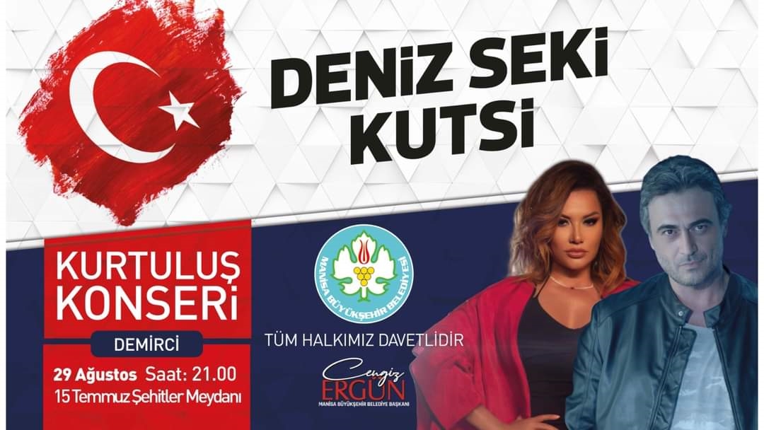 Manisa Büyükşehir Belediyesi tarafından düzenlenecek olan Deniz Seki ve Kutsi konseri 29 Ağustos Pazartesi günü saat: 21.00'da belediye hizmet binası önündeki 15 Temmuz Demokrasi Meydanında yapılacak.