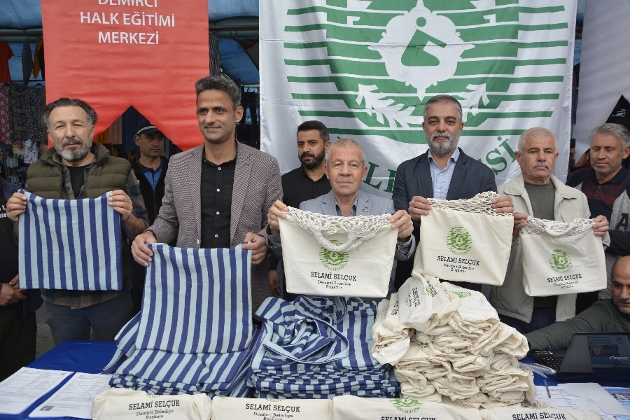 Pazarda sanat var sergisinde Halk Eğitimi Merkezi Müdürlüğünce açılan sıfır atık ve geri dönüşüm kursunda atık ve eski kumaşlardan hazırlanan bez çantalar ve demirci belediyesince hazırlanan bez çantalara pazara alışverişe gelen vatandaşlara hediye edildi.